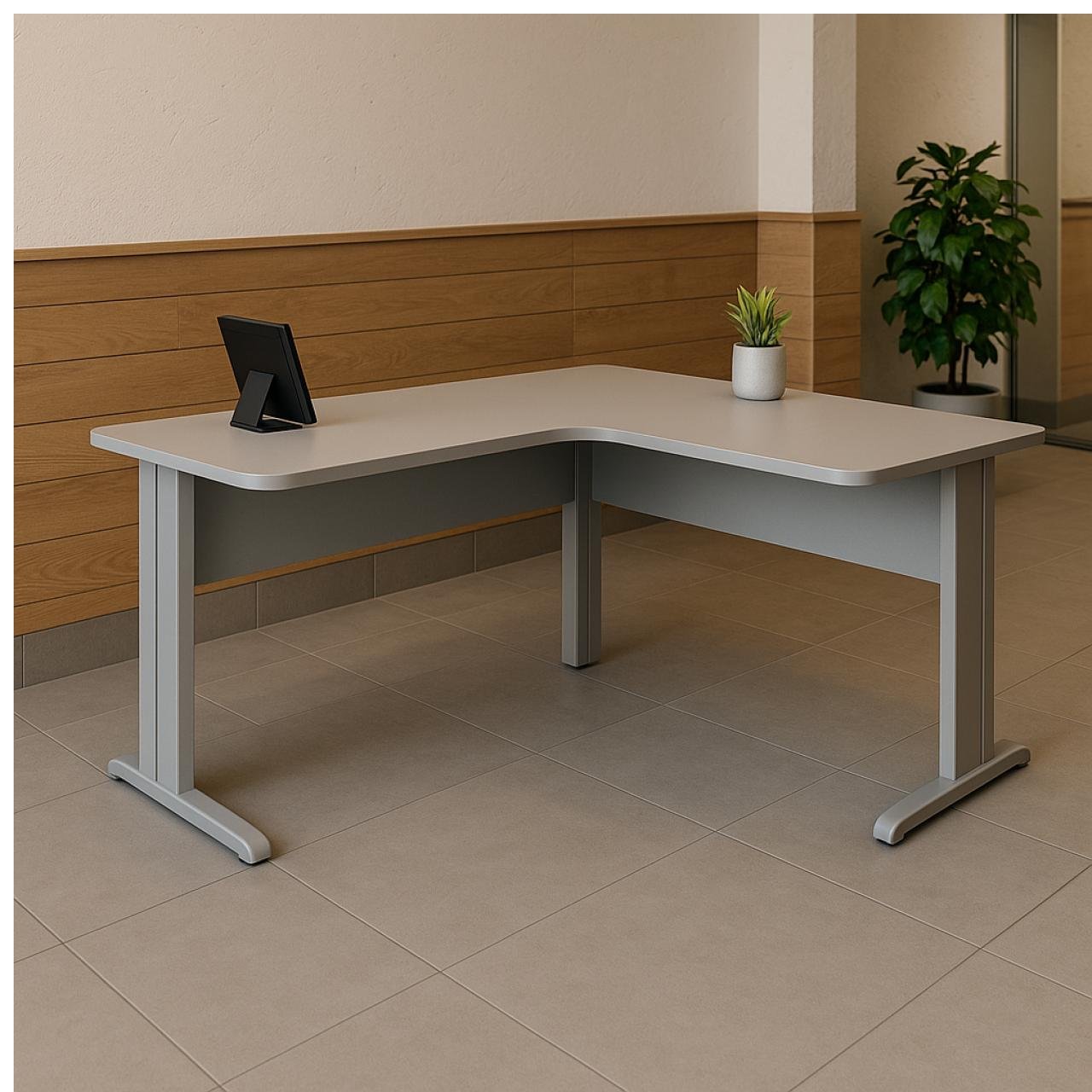 Ideal para escritórios, recepções e ambientes corporativos que exigem aproveitamento de canto com estética moderna e funcional.