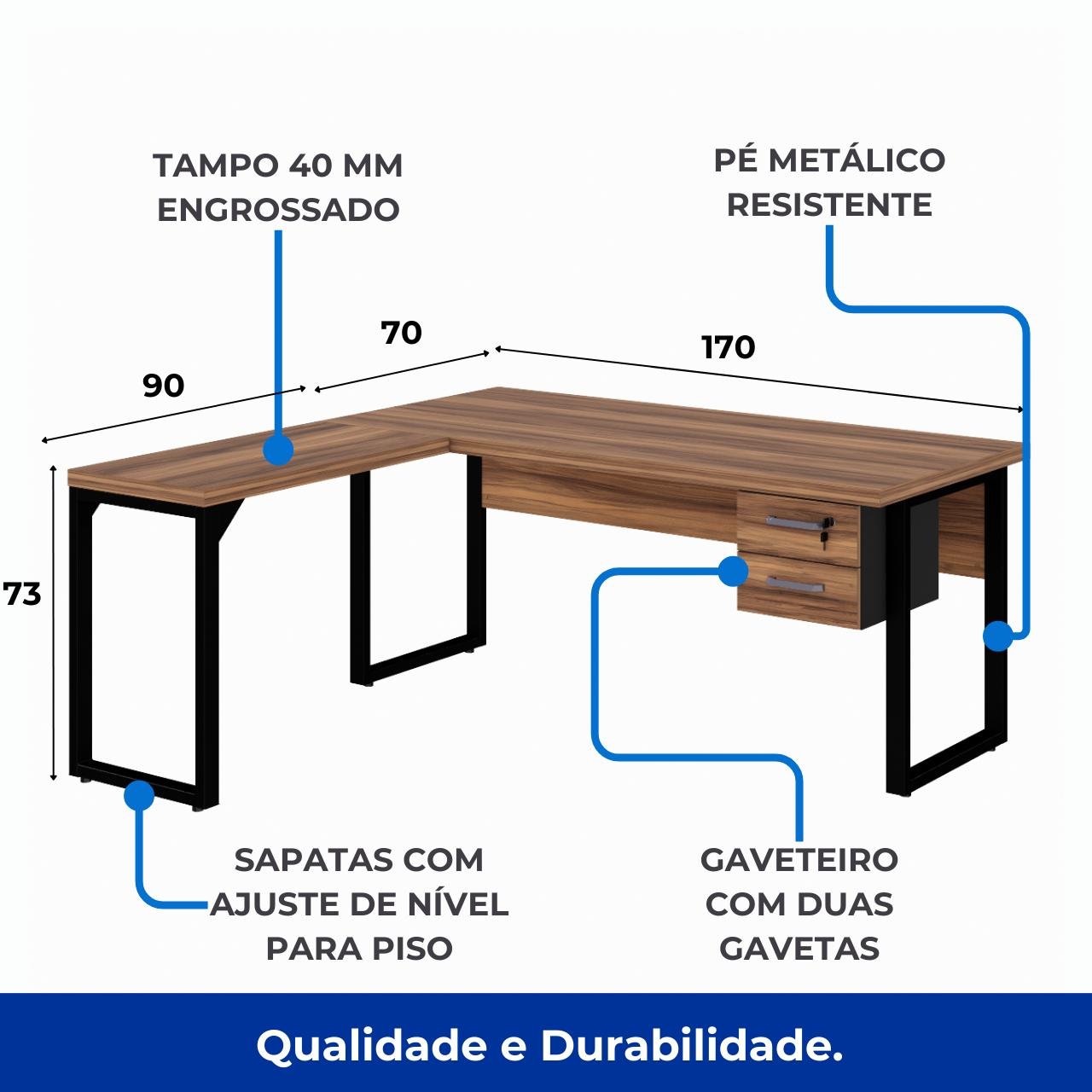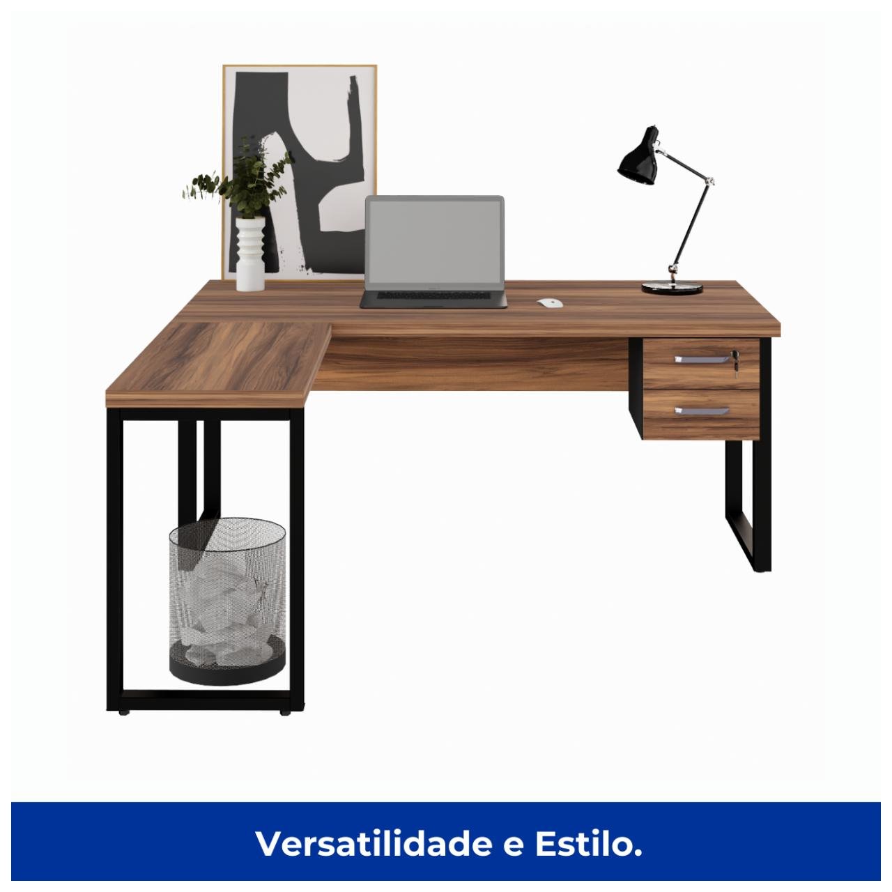 Mesa em L PÉ QUADRO (Mesa 1,70m + Mesa Auxiliar) – C/ Gavetas NOGAL SEVILHA/PRETO – 24479