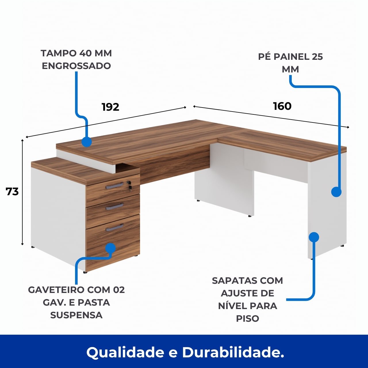 Mesa em formato “L”, moderna e funcional, ideal para escritórios executivos e ambientes corporativos. Combina elegância com praticidade, oferecendo amplo espaço de trabalho, gaveteiro integrado e tampo com acabamento sofisticado.